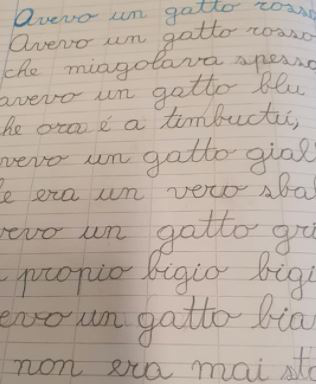 The impact of this methodology should be to minimize children's graphic and graph motor difficulties and facilitate perceptive skills in the recognition of letters in italics that can sometimes also be related to the visual complexity typical of the font. Expanding this methodology then to the complexities of union between the different letters that go to build a whole word, I expect to see the construction by the children of a technically correct track, that is, free from motor distortions and improbable programming that make writing difficult to read and excessively tiring for the students. I also expect to find greater perceptual and spatial ability. The possible measurement of the acquired learning could be verified through the administration at a distance of time of the TPV test (visual perception test) able to verify the improvements in perceptual visuo skills and subsequently through BKK tests to verify the quality of the graphic trace. The second type of verification should be administered at the beginning of the writing learning path, to probe the incoming graph motor skills and thus be able to compare them after the end of the entire acquisition process.